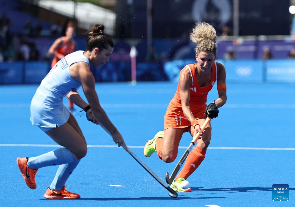 Maria Verschoor (R) of the Netherlands vies for the ball during the women's hockey semi-final match between the Netherlands and Argentina at the Paris 2024 Olympic Games in Colombes, France, Aug. 7, 2024. (Xinhua/Ren Pengfei)