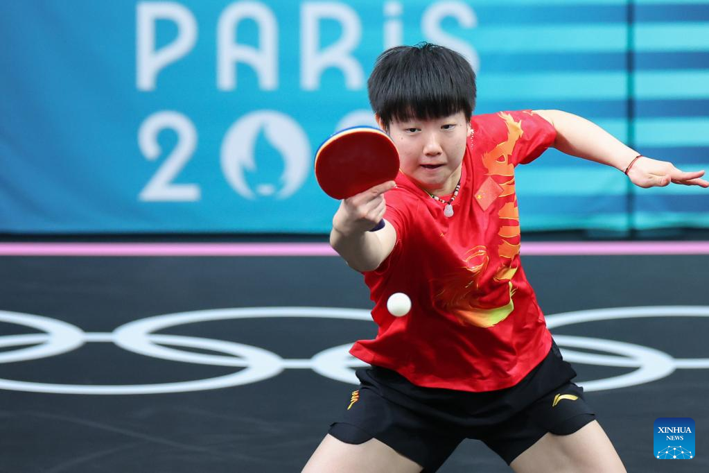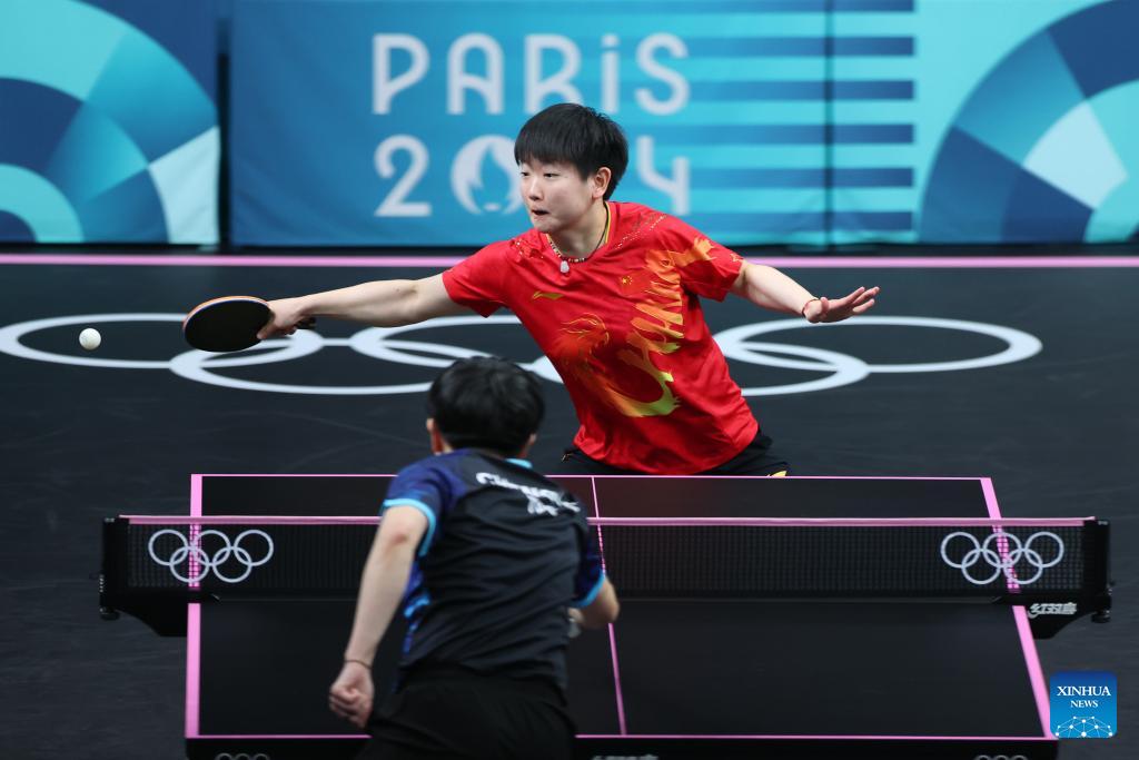 Sun Yingsha of China competes against Cheng I-Ching of Chinese Taipei during the women's team quarterfinal of table tennis between China and Chinese Taipei at the Paris 2024 Olympic Games in Paris, France, on Aug. 7, 2024. (Xinhua/Liu Xu)