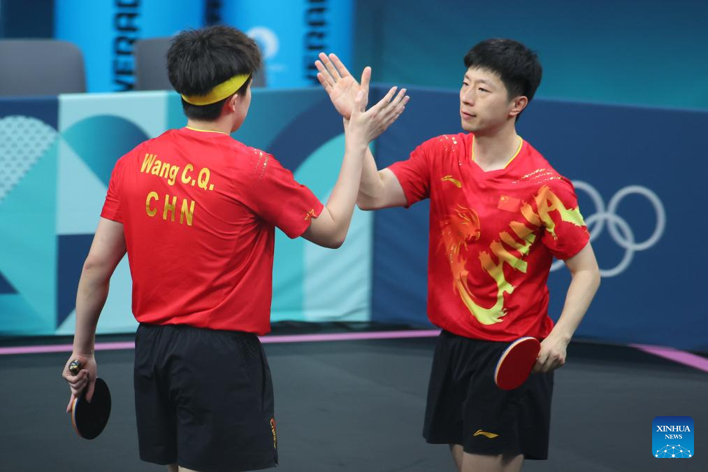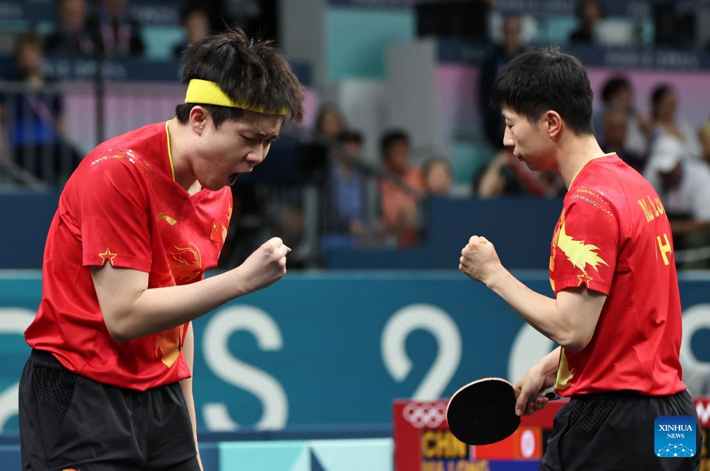 Ma Long (R)/Wang Chuqin of China react while competing against Cho Daeseong/Jang Woojin of South Korea during the men's team quarterfinal of table tennis between China and South Korea at the Paris 2024 Olympic Games in Paris, France, on Aug. 7, 2024. (Xinhua/Liu Xu)