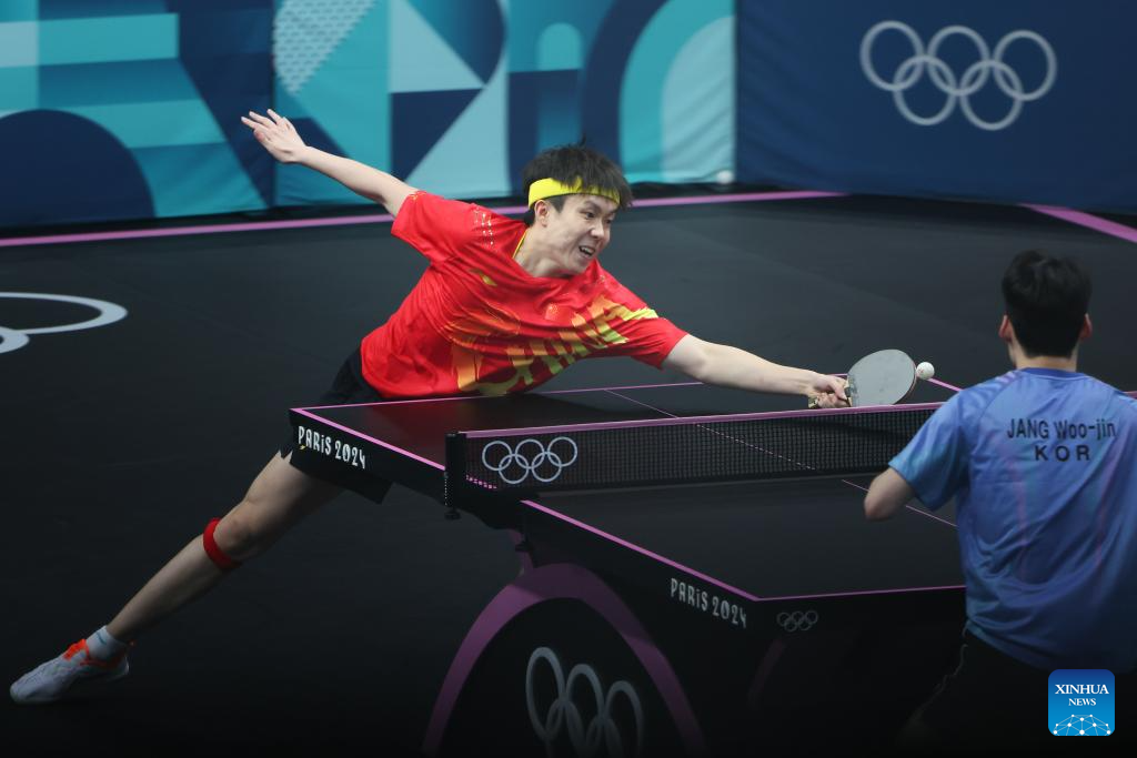 Wang Chunqin (top) of China competes against Jang Woojin of South Korea during the men's team quarterfinal of table tennis between China and South Korea at the Paris 2024 Olympic Games in Paris, France, on Aug. 7, 2024. (Xinhua/Liu Xu)