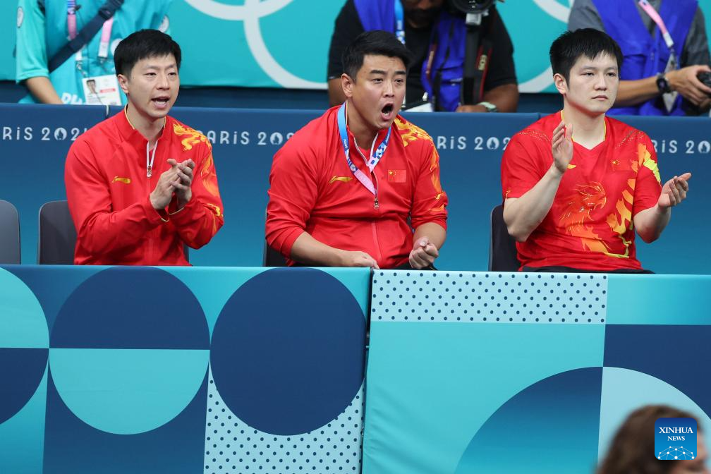 Coach Wang Hao (C), players Ma Long (L) and Fan Zhendong of China react during the men's team quarterfinal of table tennis between China and South Korea at the Paris 2024 Olympic Games in Paris, France, on Aug. 7, 2024. (Xinhua/Liu Xu)