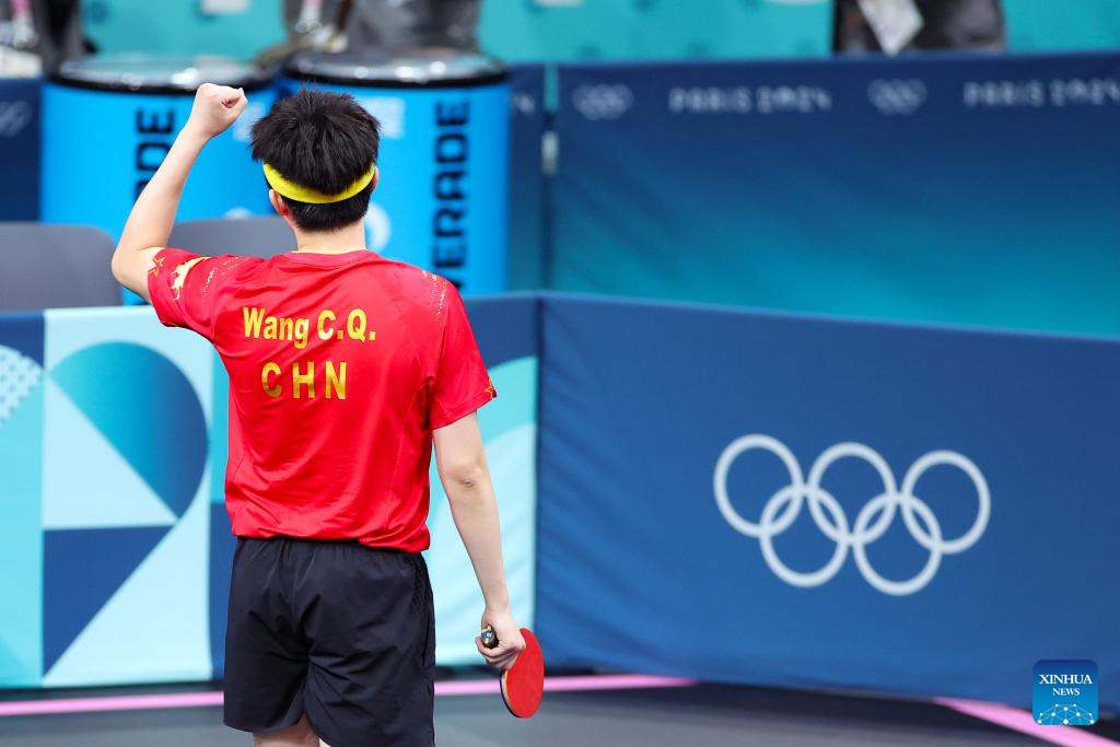 Wang Chunqin of China reacts while competing against Jang Woojin of South Korea during the men's team quarterfinal of table tennis between China and South Korea at the Paris 2024 Olympic Games in Paris, France, on Aug. 7, 2024. (Xinhua/Liu Xu)