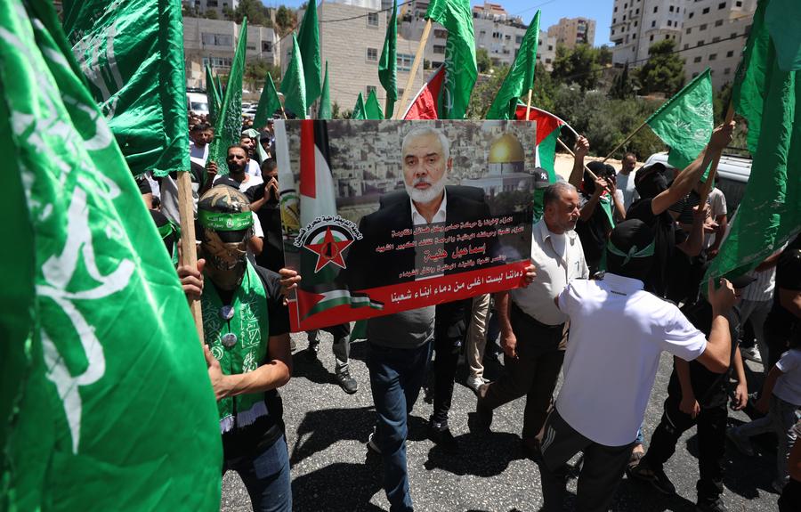 People take part in a protest against the assassination of Hamas Politburo Chief Ismail Haniyeh in the West Bank city of Hebron, July 31, 2024. (Photo by Mamoun Wazwaz/Xinhua)