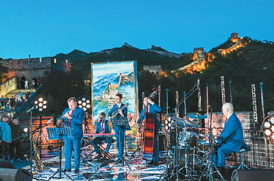 Russian saxophonist Igor Butman (1st L) and other orchestra members perform at the foot of the Badaling section of the Great Wall in Yanqing district, Beijing. (Photo/Lu Jun)