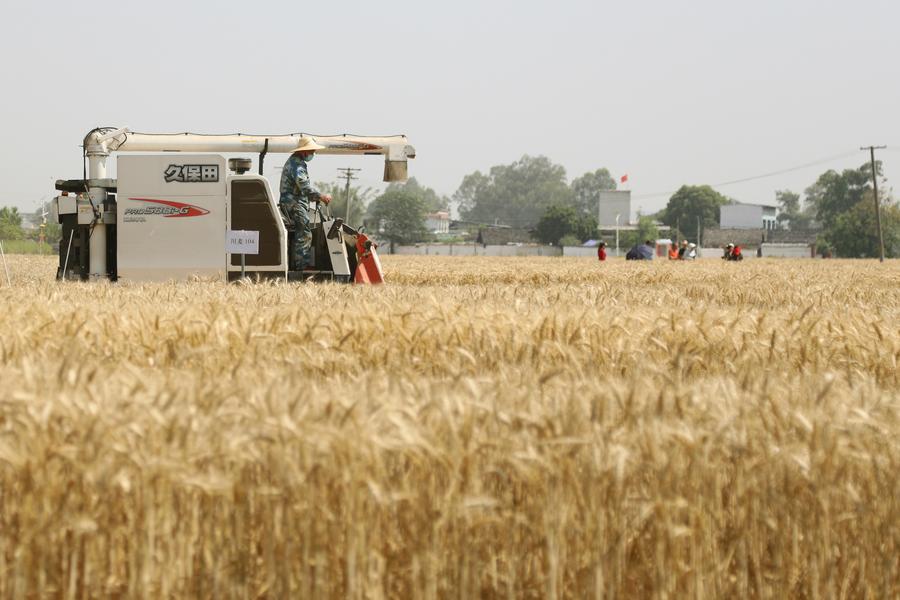 A staff member harvests wheat at an agricultural industrial park in Guanghan City, southwest China's Sichuan Province, May 13, 2024. (Xinhua/Yang Jin)
