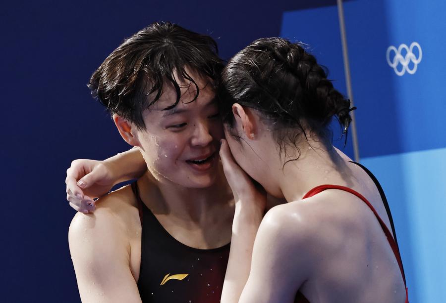 Chen Yiwen (L) and Chang Yani of China react after the women's 3m springboard final of diving at the Paris 2024 Olympic Games in Saint-Denis, France, Aug. 9, 2024. (Xinhua/Zhang Yuwei)