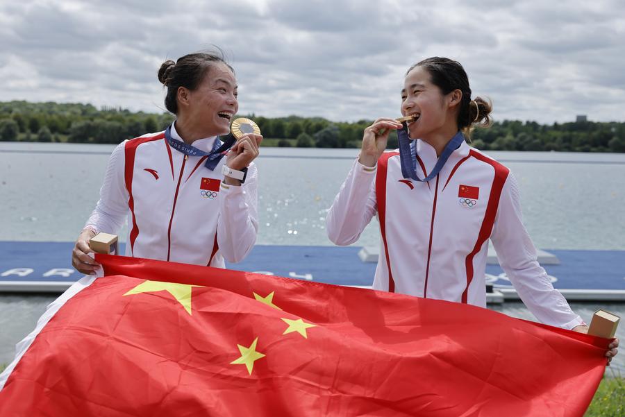 Gold medalists Xu Shixiao (R)/Sun Mengya of China attend the awarding ceremony after the women's canoe double 500m final of canoe sprint at the Paris 2024 Olympic Games in Vaires-sur-Marne, France, on Aug. 9, 2024. (Xinhua/Shen Bohan)
