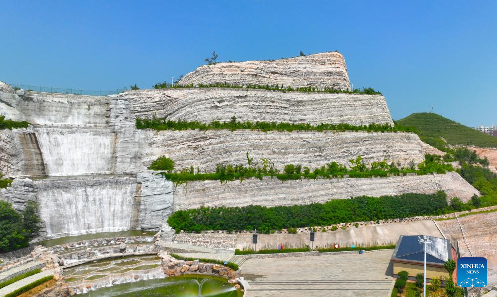 This photo taken on April 13, 2022 shows the Beipiao mountain park under construction in Beipiao City, northeast China's Liaoning Province. Liaoning has strengthened restoration of ecological environment and accelerated the comprehensive treatment of mines in recent years. The quarry-transformed mountain park in Beipiao provides a summer resort for visitors. (Xinhua)