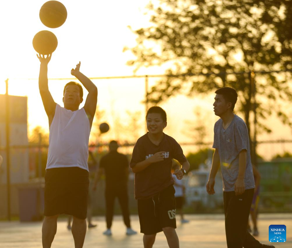 Citizens play basketball at the Beipiao mountain park in Beipiao City, northeast China's Liaoning Province, Aug. 8, 2024. Liaoning has strengthened restoration of ecological environment and accelerated the comprehensive treatment of mines in recent years. The quarry-transformed mountain park in Beipiao provides a summer resort for visitors. (Xinhua/Yang Qing)