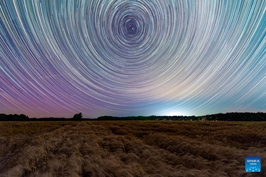 This composite photo taken on July 30, 2024 shows star trails over a wheat field in Wanyou Village of Shangjieji Town, Fujin City, northeast China's Heilongjiang Province. (Photo by Qu Yubao/Xinhua)