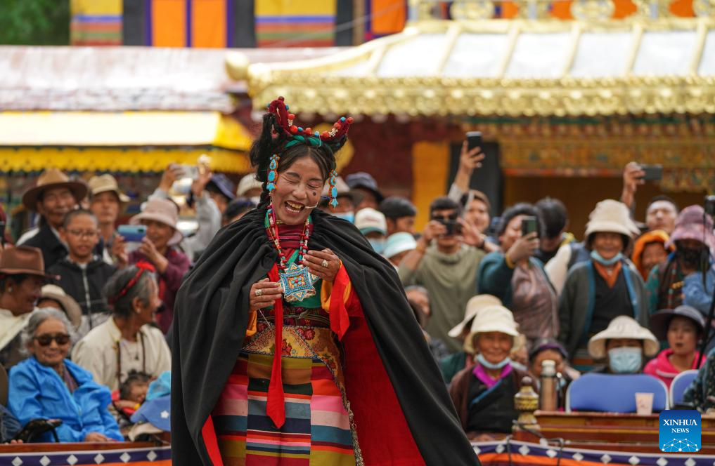 An artist stages a Tibetan opera performance at Norbulingka in Lhasa, southwest China's Xizang Autonomous Region, Aug. 8, 2024. Tibetan opera performances are staged here from Aug. 4 to Aug. 10 in celebration of the traditional Shoton Festival, or Yogurt Festival. (Xinhua/Jigme Dorje)