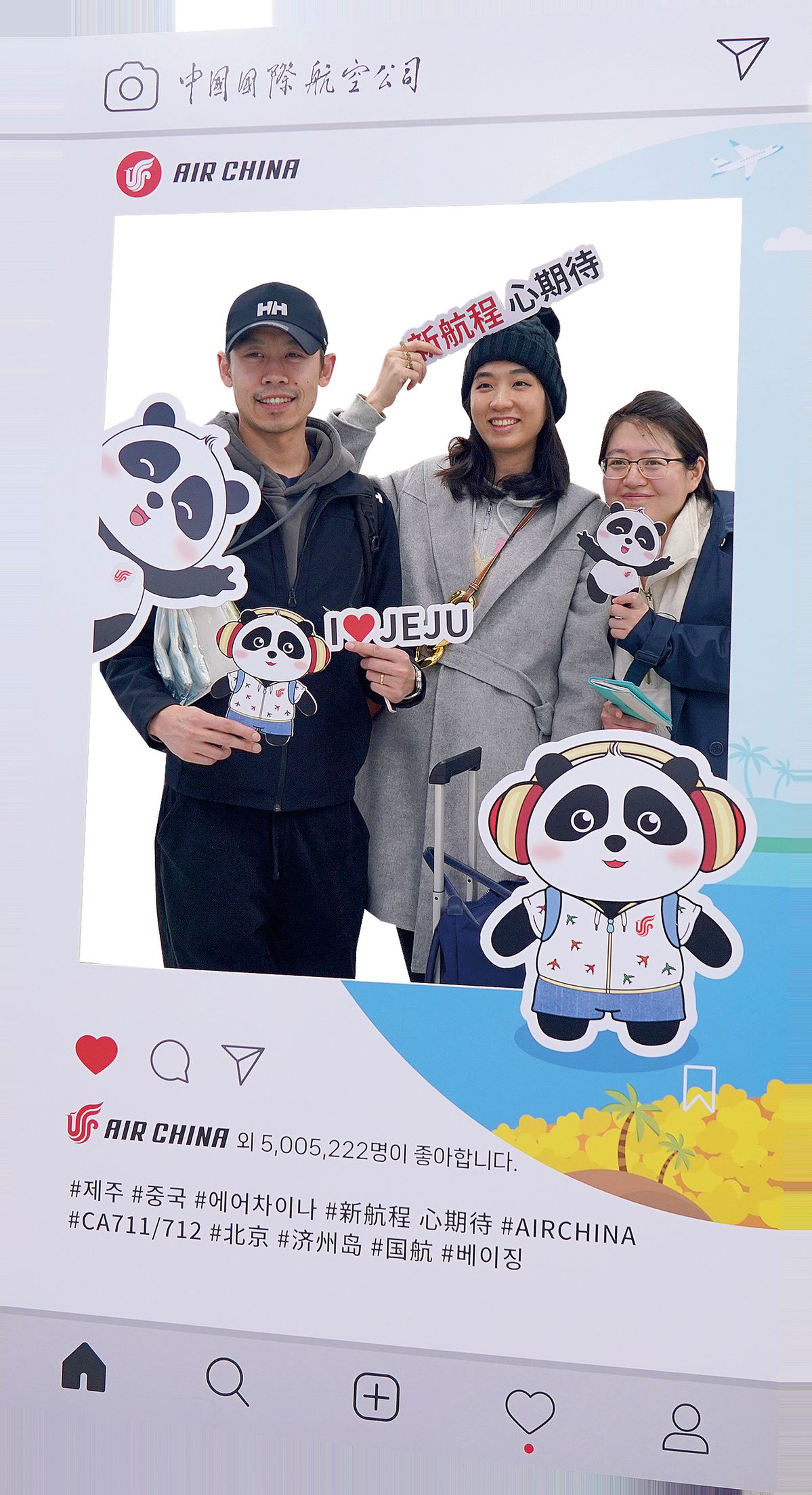 Passengers boarding the Air China flight from Jeju to Beijing take photos in the check-in area at Jeju International Airport in South Korea on March 31, when the resumption ceremony of the Air China Beijing-Jeju route was held. (SUN YIRAN/XINHUA)