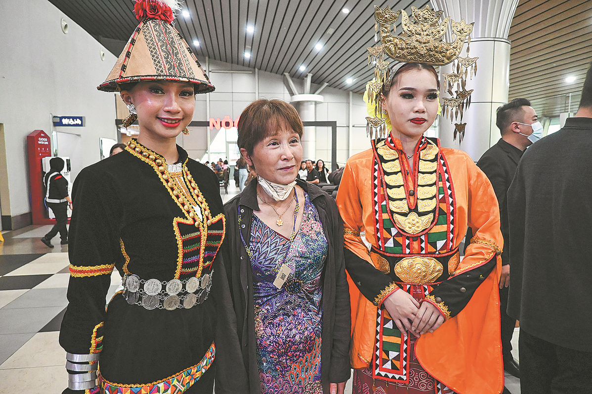 A passenger from Fuzhou, Fujian province poses for a photo with greeters at the Kota Kinabalu International Airport, in the Malaysian state of Sabah, on June 27, when Xiamen Airlines resumed its Fuzhou-Kota Kinabalu route. (CHENG YIHENG/XINHUA)