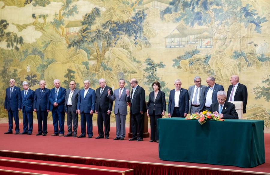 Chinese Foreign Minister Wang Yi, also a member of the Political Bureau of the Communist Party of China Central Committee, attends the closing ceremony of a reconciliation dialogue among Palestinian factions and witnesses the signing of a declaration on ending division and strengthening unity by 14 Palestinian factions, in Beijing, capital of China, July 23, 2024. (Xinhua/Zhai Jianlan)
