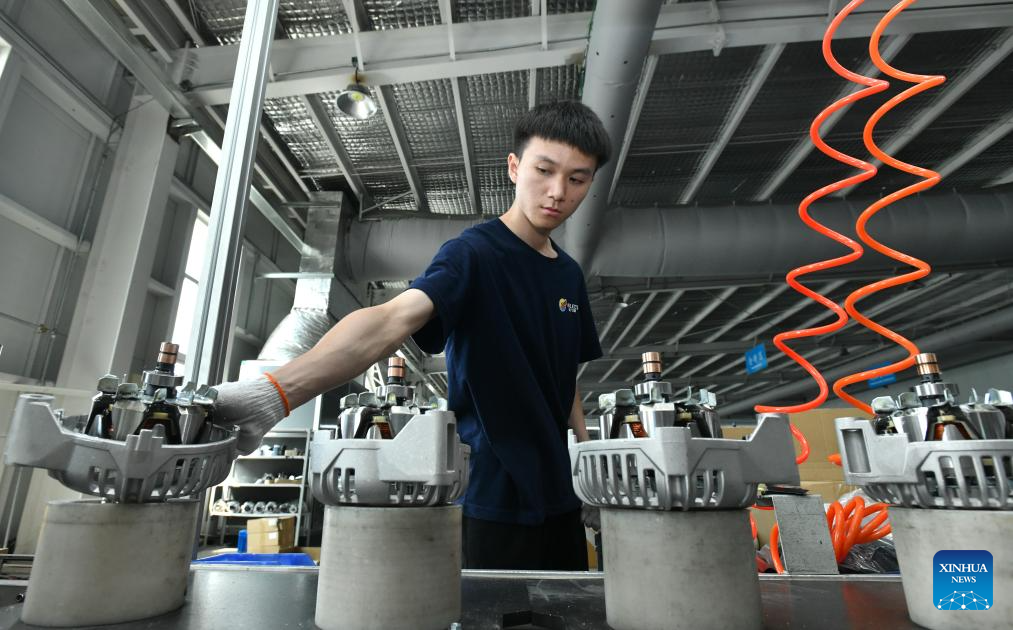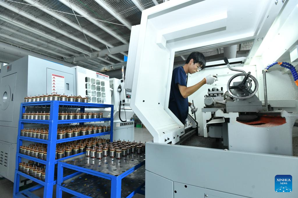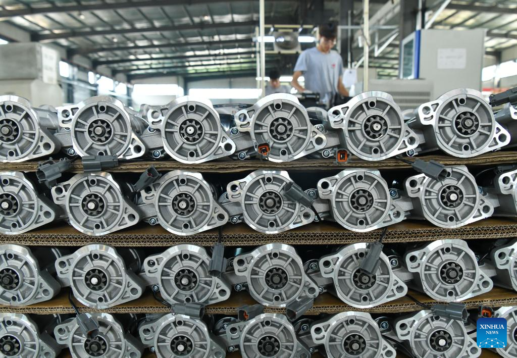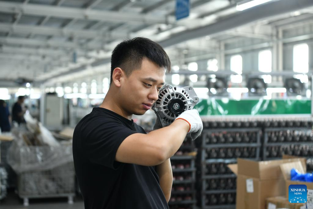 A man works on an automotive parts production line at Hebei Jianglun Electrical Co., Ltd. in Hejian city, north China's Hebei province, Aug. 10, 2024. There are more than 170 remanufaturing enterprises in Hejian city, focusing on areas of automotive parts, oil drilling equipment, and computer servers. They were recognized by the Ministry of Industry and Information Technology as a distinctive industrial cluster of small and medium enterprises in 2022, and generated a combined revenue of more than 14 billion yuan (about 1.96 billion US dollars) in 2023. (Xinhua/Mu Yu)