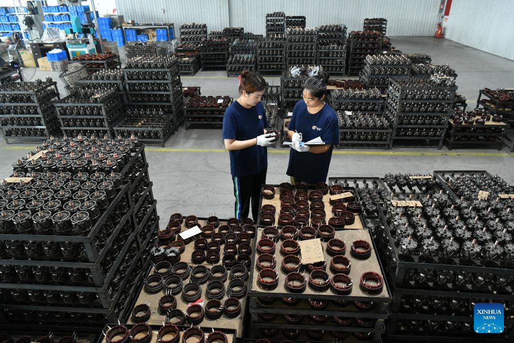 Workers check product information at Hebei Ailees Auto Parts Co., Ltd. in Hejian city, north China's Hebei province, Aug. 10, 2024. There are more than 170 remanufaturing enterprises in Hejian city, focusing on areas of automotive parts, oil drilling equipment, and computer servers. They were recognized by the Ministry of Industry and Information Technology as a distinctive industrial cluster of small and medium enterprises in 2022, and generated a combined revenue of more than 14 billion yuan (about 1.96 billion US dollars) in 2023. (Xinhua/Mu Yu)