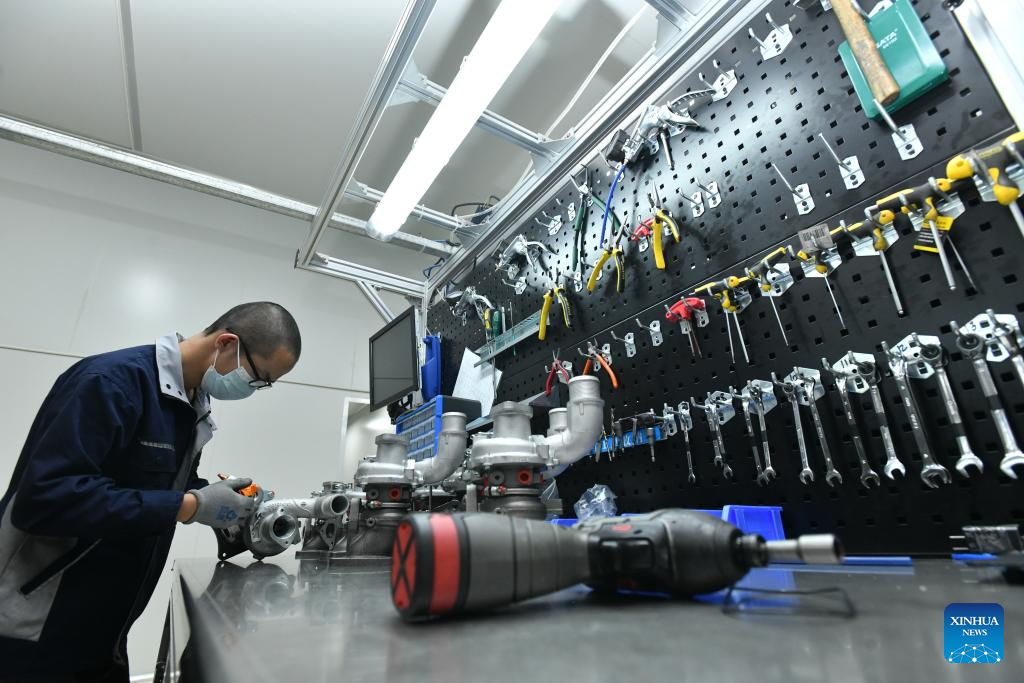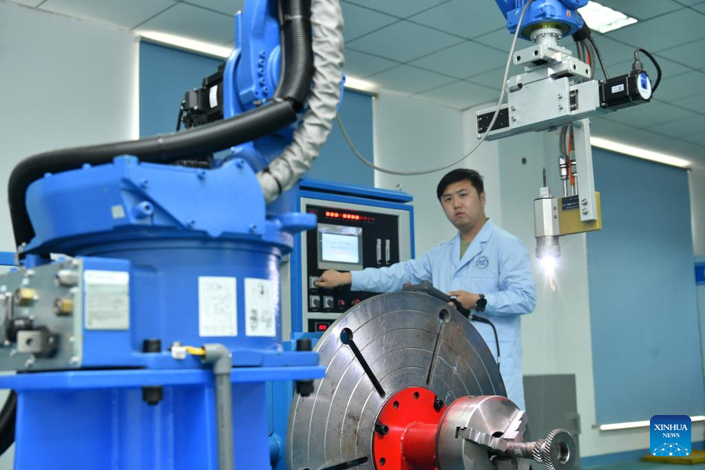 A technician works at a laboratory of the Institute of Remanufaturing Industry &Technology, Jing-Jin-Ji in Hejian city, north China's Hebei province, Aug. 10, 2024. There are more than 170 remanufaturing enterprises in Hejian city, focusing on areas of automotive parts, oil drilling equipment, and computer servers. They were recognized by the Ministry of Industry and Information Technology as a distinctive industrial cluster of small and medium enterprises in 2022, and generated a combined revenue of more than 14 billion yuan (about 1.96 billion US dollars) in 2023. (Xinhua/Mu Yu)