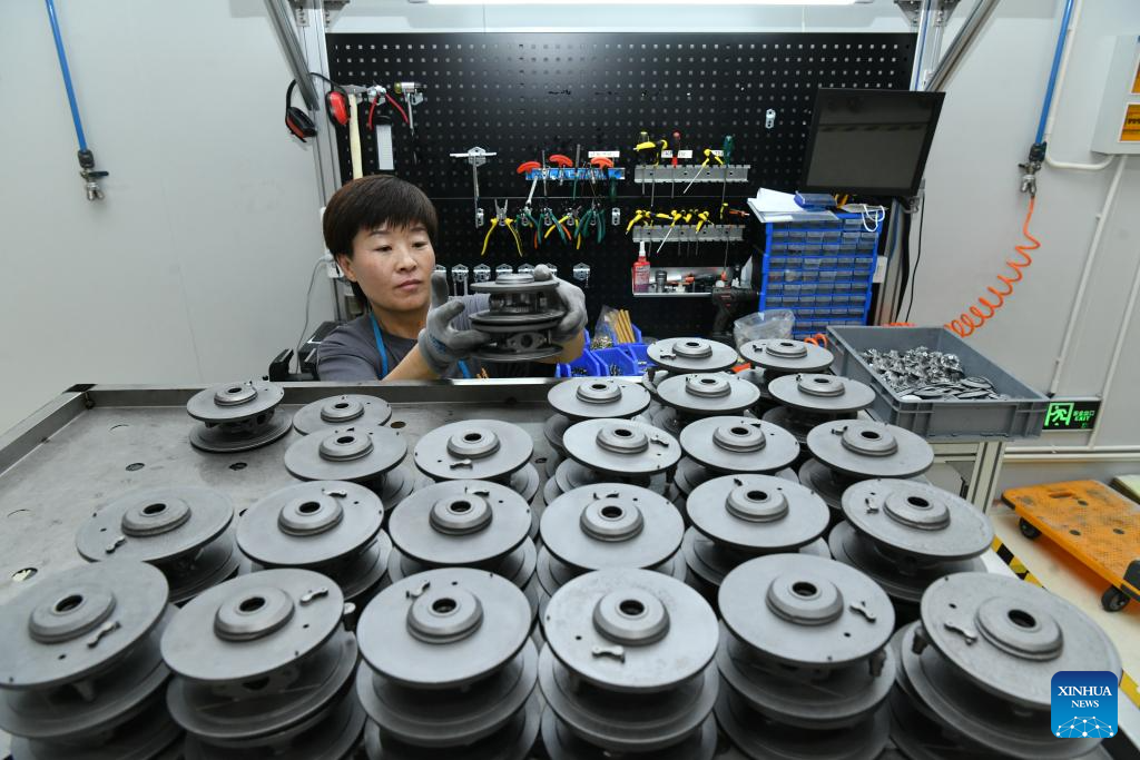 A worker tests products at Hebei Ailees Auto Parts Co., Ltd. in Hejian city, north China's Hebei province, Aug. 10, 2024. There are more than 170 remanufaturing enterprises in Hejian city, focusing on areas of automotive parts, oil drilling equipment, and computer servers. They were recognized by the Ministry of Industry and Information Technology as a distinctive industrial cluster of small and medium enterprises in 2022, and generated a combined revenue of more than 14 billion yuan (about 1.96 billion US dollars) in 2023. (Xinhua/Mu Yu)