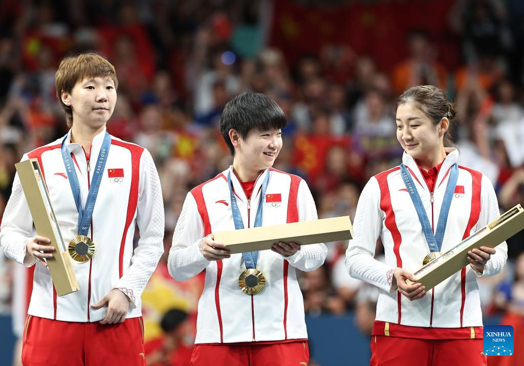 Gold medalists of team China gesture during the victory ceremony for women's team of table tennis at the Paris 2024 Olympic Games in Paris, France, on Aug. 10, 2024. (Xinhua/Liu Xu)