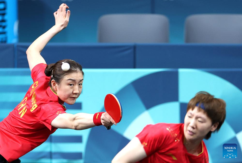 Chen Meng (L)/Wang Manyu of China compete against Hayata Hina/Harimoto Miwa of Japan during the women's team gold medal match of table tennis between China and Japan at the Paris 2024 Olympic Games in Paris, France, on Aug. 10, 2024. (Xinhua/Liu Xu)