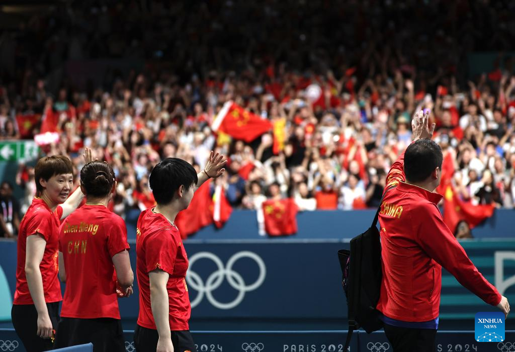 Team China wave to spectators after the women's team gold medal match of table tennis between China and Japan at the Paris 2024 Olympic Games in Paris, France, on Aug. 10, 2024. (Xinhua/Wang Dongzhen)