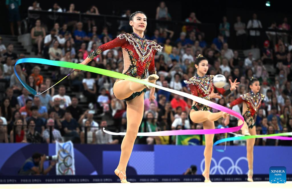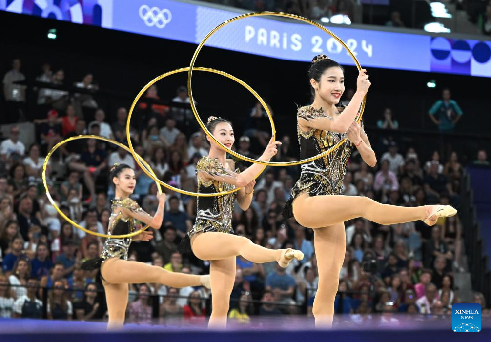 Athletes of Team China compete during the group all-round final of rhythmic gymnastics at the Paris 2024 Olympic Games in Paris, France, Aug. 10, 2024. (Xinhua/Cheng Min)
