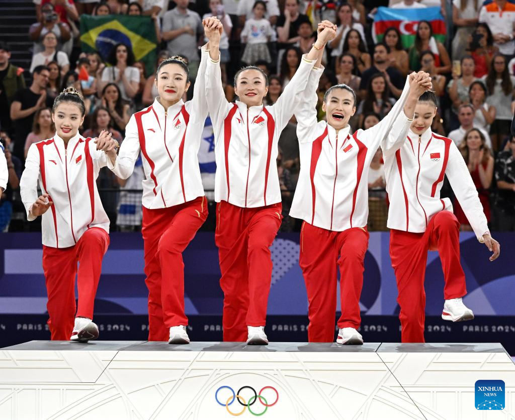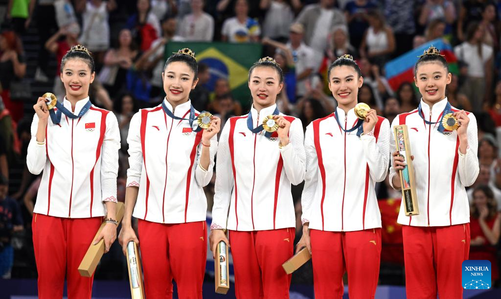 Gold medalists of team China attend the awarding ceremony for the group all-round of rhythmic gymnastics at the Paris 2024 Olympic Games in Paris, France, Aug. 10, 2024. (Xinhua/Cheng Min)