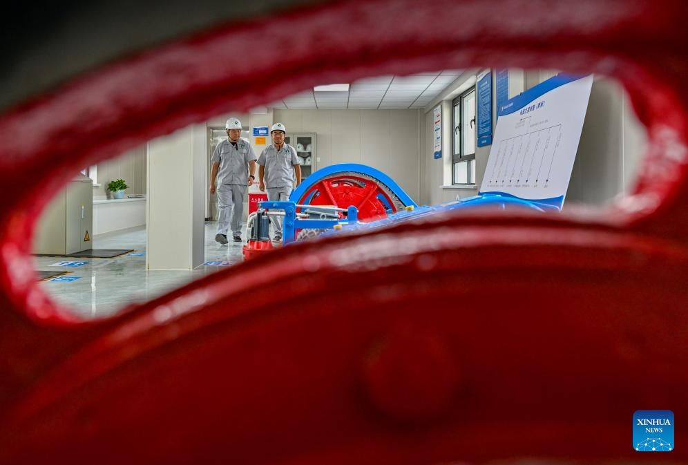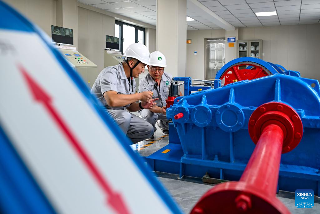 Staff members check the gate hoists at the Daxihaizi Reservoir before water diversion in Yuli County, northwest China's Xinjiang Uygur Autonomous Region, on Aug. 11, 2024. Northwest China's Xinjiang Uygur Autonomous Region on Monday began discharging water from a reservoir into the Tarim River, China's longest inland river, as part of an ongoing ecological conservation project in the region.
