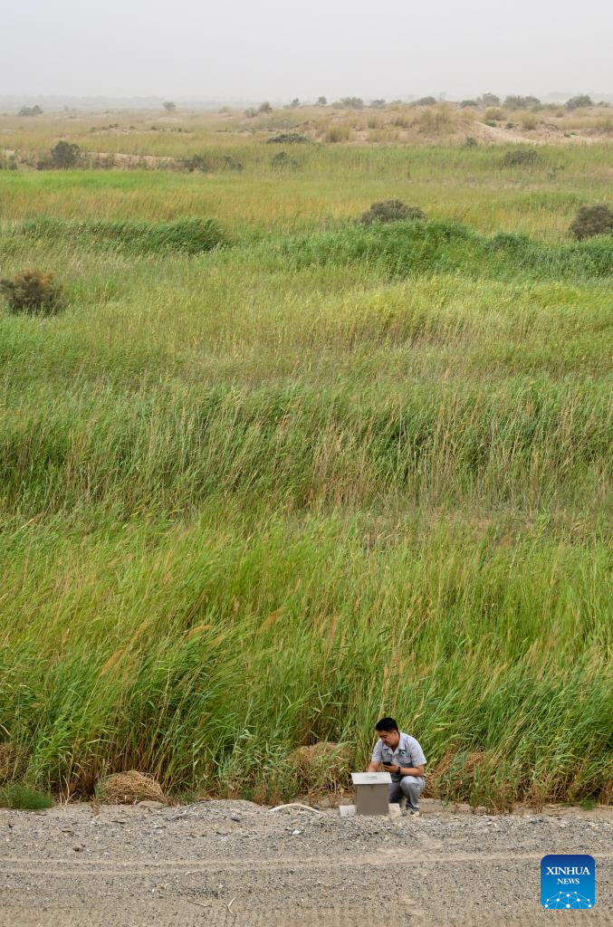 Xinjiang has planned to divert 510 million cubic meters of floodwater this year to replenish the water supply of the populus euphratica forests in the Tarim River Basin, with 346 million cubic meters finished as of Aug. 8. (Xinhua/Chen Shuo)