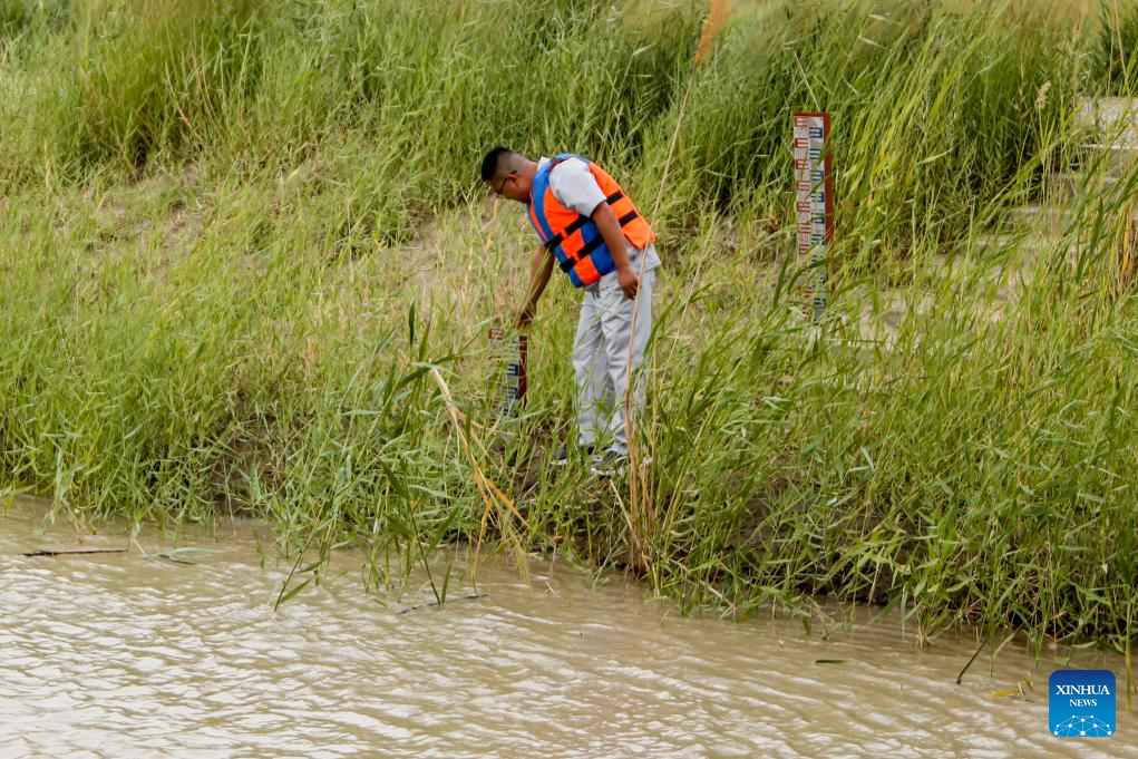 A staff member checks the water level before water diversion at the Daxihaizi Reservoir in Yuli County, northwest China's Xinjiang Uygur Autonomous Region, on Aug. 11, 2024. Northwest China's Xinjiang Uygur Autonomous Region on Monday began discharging water from a reservoir into the Tarim River, China's longest inland river, as part of an ongoing ecological conservation project in the region.