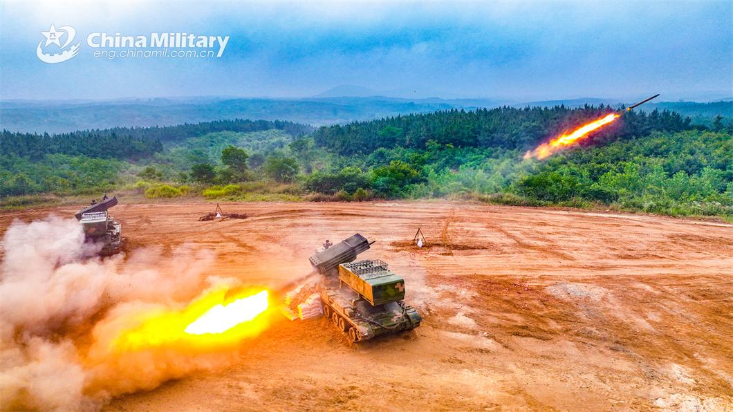 Multiple launch rocket systems attached to a brigade under the PLA 71st Group Army fire at mock targets during a live-fire training exercise on June 20, 2024. (eng.chinamil.com.cn/Photo by Zhao Genyuan)