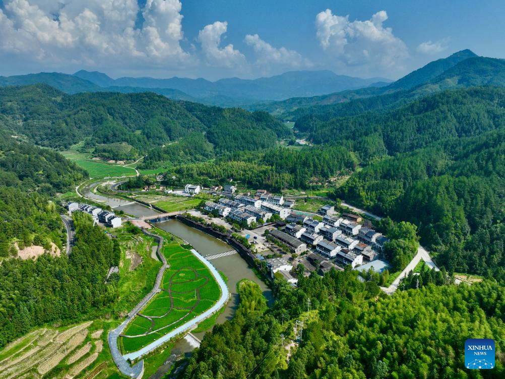 An aerial drone photo shows a view of Changkou Village of Jiangle County, Sanming City, southeast China's Fujian Province, Aug. 10, 2024. Sanming City has been exploring a new path of development that embraces green transformation to boost rural tourism including forest-based health services and other economic activities. Currently, forests cover 77.12 percent of the total area in the city. (Xinhua/Jiang Kehong)