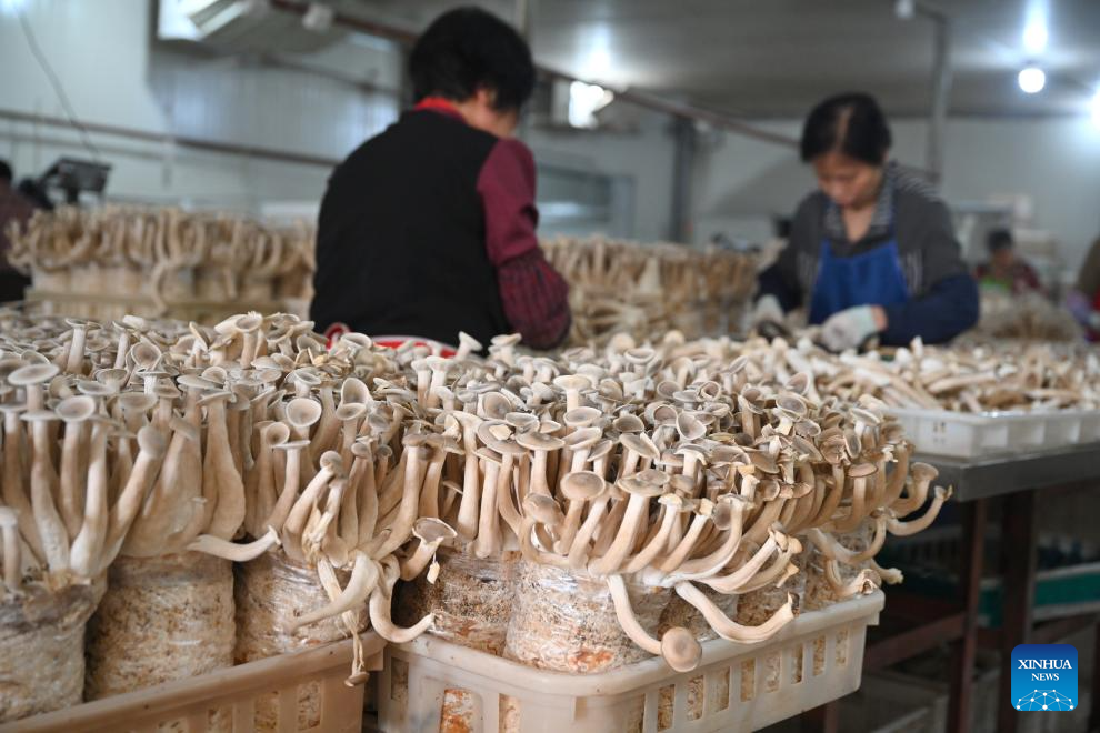Staff members process edible fungi at a company in Xiamao Township of Sanming City, southeast China's Fujian Province, May 9, 2024. Sanming City has been exploring a new path of development that embraces green transformation to boost rural tourism including forest-based health services and other economic activities. Currently, forests cover 77.12 percent of the total area in the city. (Xinhua/Jiang Kehong)