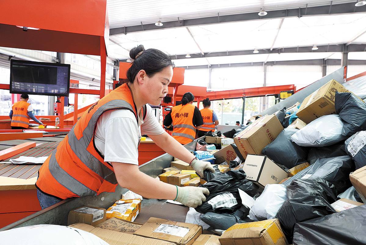 Staff members at the joint distribution center in Yucheng handle parcels with the help of a sorting machine. (Photo by ZHANG YU/CHINA NEWS SERVICE)