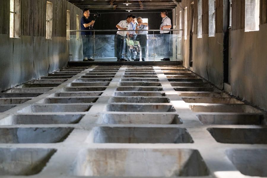 Hideo Shimizu (2nd R, front) identifies the crimes of the Japanese germ-warfare at the former site of Unit 731 in Harbin, northeast China's Heilongjiang Province, Aug. 13, 2024. (Xinhua/Xie Jianfei)