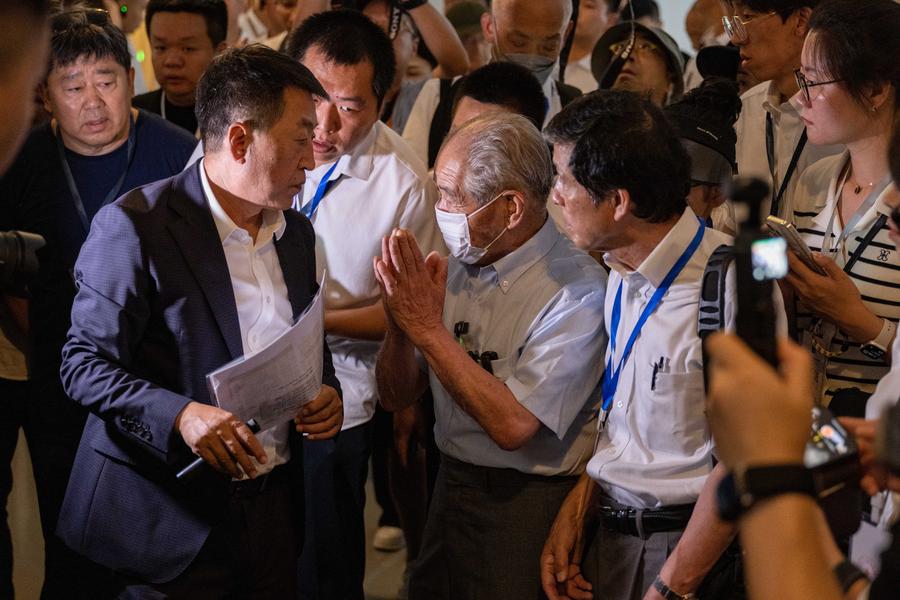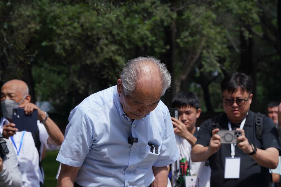 Hideo Shimizu (2nd L, front) puts his palms together as he identifies the crimes of the Japanese germ-warfare at the former site of Unit 731 in Harbin, northeast China's Heilongjiang Province, Aug. 13, 2024. (Xinhua/Xie Jianfei)