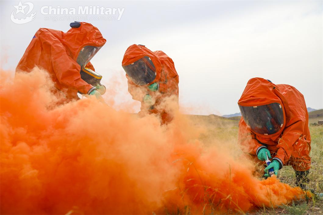 Soldiers assigned to a regiment of the PLA Xinjiang Military Command detect simulated noxious gas during a chemical defense emergency training exercise on July 10, 2024. (eng.chinamil.com.cn/Photo by Mei Junqi)
