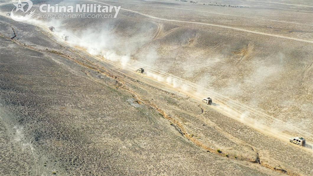 Vehicles attached to a regiment of the PLA Xinjiang Military Command maneuver to the designated area during a chemical defense emergency training exercise on July 10, 2024. (eng.chinamil.com.cn/Photo by Mei Junqi)