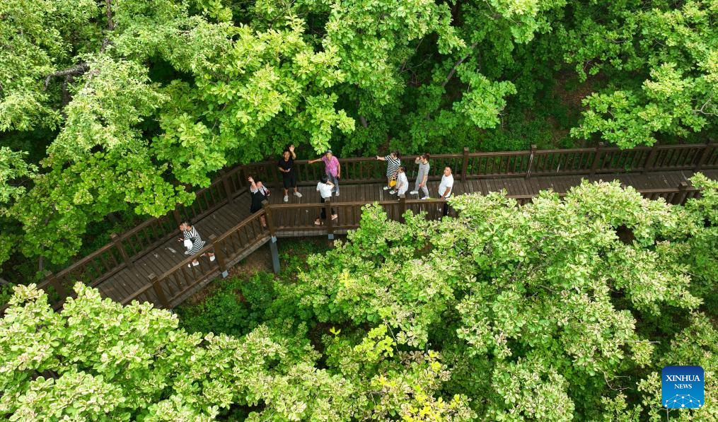 An aerial drone photo taken on July 6, 2024 shows people visiting Xiushui national wetland park in Zhalantun City, north China's Inner Mongolia Autonomous Region. As the eastern part of the Three-North Shelterbelt Forest Program (TSFP), a large-scale afforestation project, northeast China has seen continuous improvement of ecological environment. China proposed in June 2023 to turn the TSFP into a fully functional and unbreakable "green Great Wall" and ecological security barrier in northern China. Launched in 1978, the TSFP aims to rehabilitate and green desert-prone lands and desertified areas in northwest, north and northeast China. (Xinhua/Bei He)