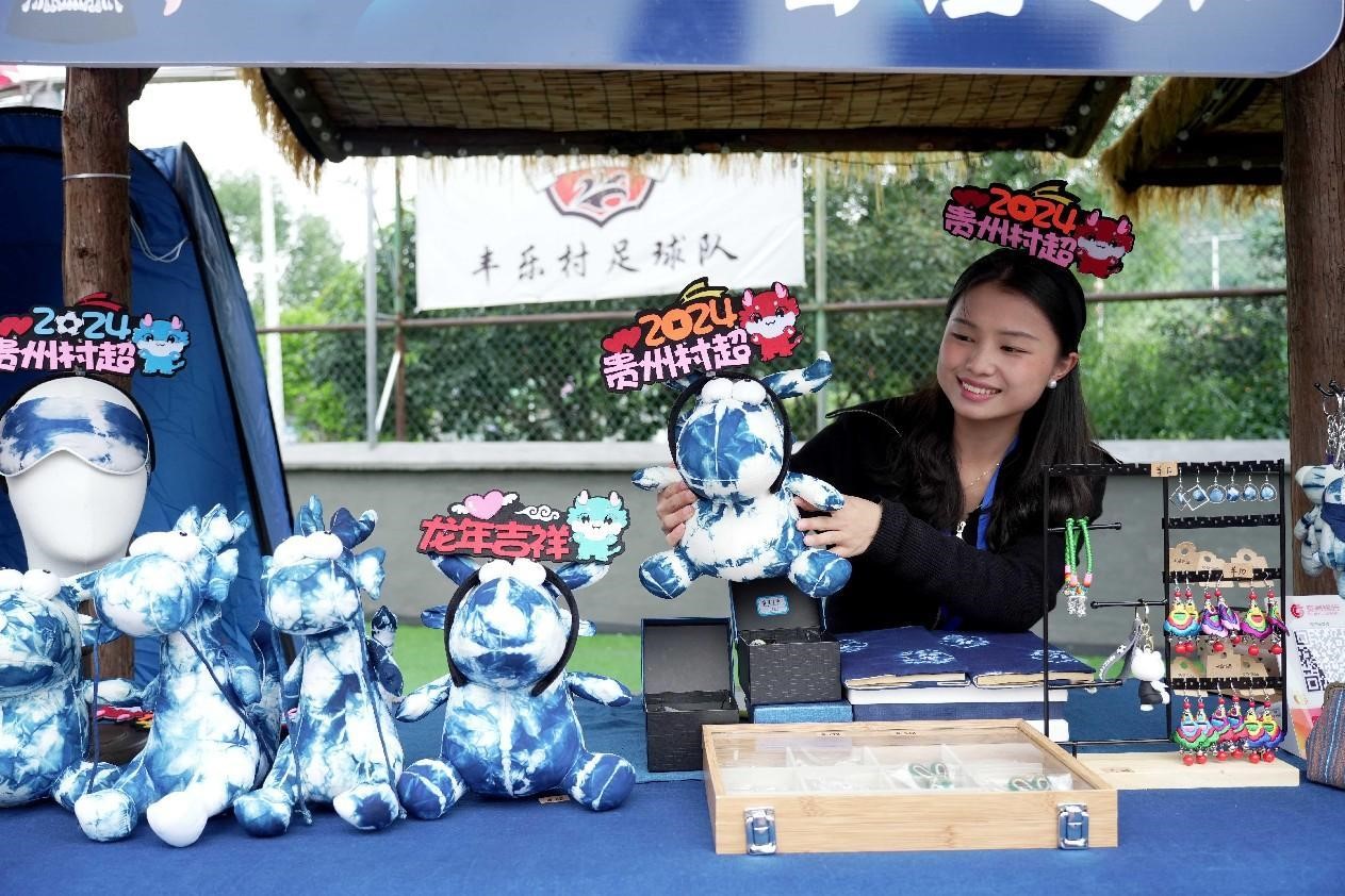 Cultural products inspired by local intangible cultural heritage are sold at a stall outside the stadium hosting the Village Super League (VSL) in Rongjiang county, southwest China's Guizhou province, May 3, 2024. (People's Daily Online/Wang Bingzhen)