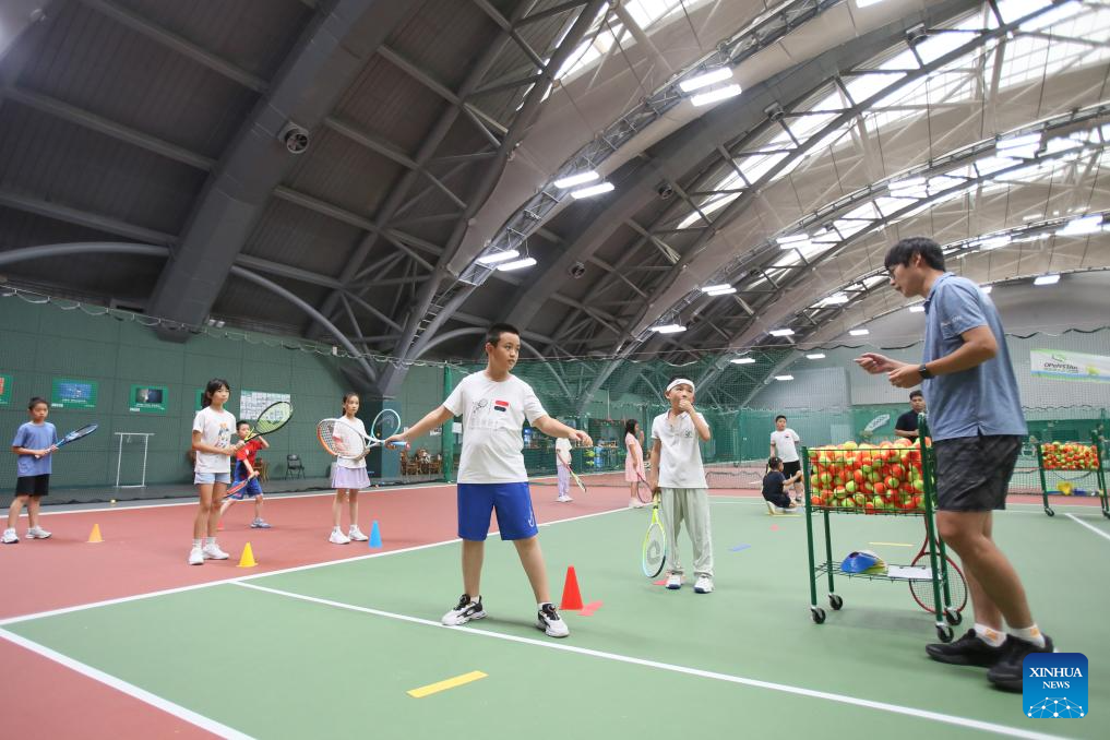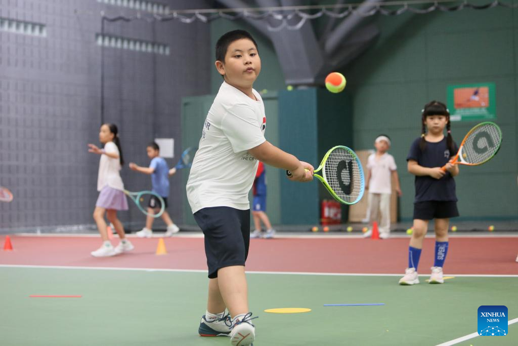 Children students participate in a tennis summer camp at a tennis club in Beijing, China, Aug. 14, 2024. (Xinhua/Cai Yang)