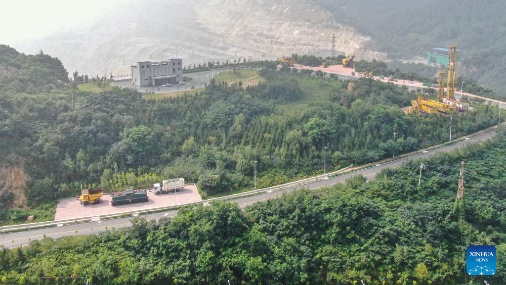 This aerial drone photo taken on Aug. 15, 2024 shows a worker mowing the lawn at the Nanfen iron open-pit mine in Benxi, northeast China's Liaoning Province. The Nanfen iron open-pit mine in northeast China's Liaoning Province in recent years has been making efforts to promote green and sustainable development. (Xinhua/Pan Yulong)