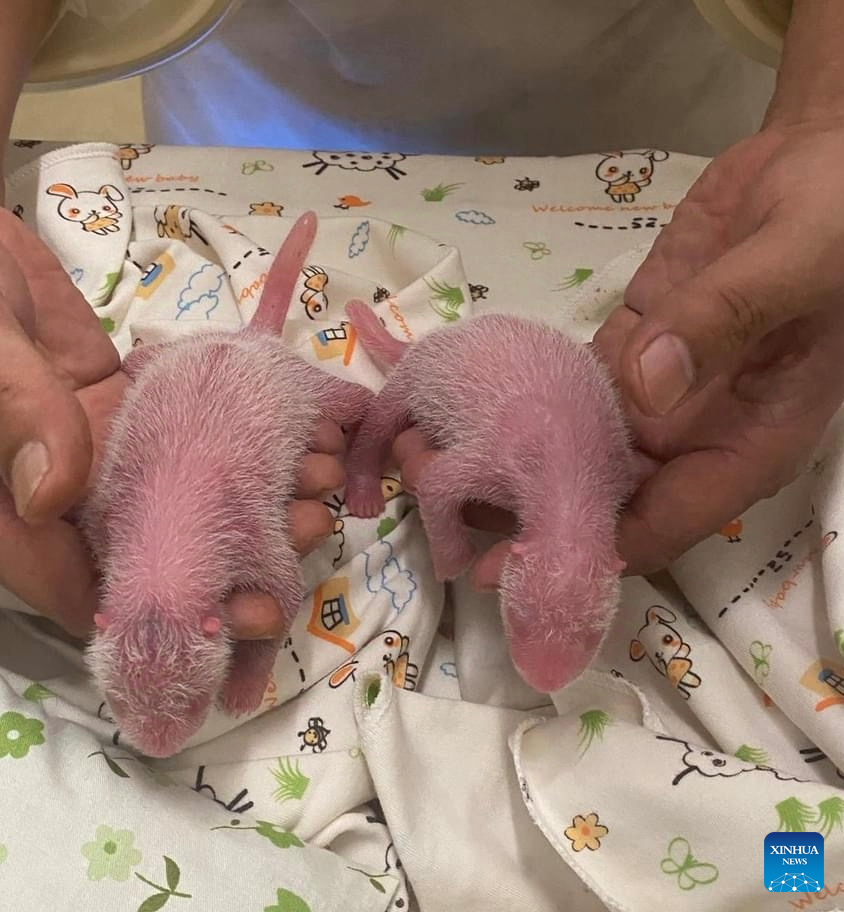 This photo released on Aug. 15, 2024 shows the panda twins. The Hong Kong Special Administrative Region (HKSAR) government on Thursday announced the birth of panda twins early Thursday morning in Hong Kong. The pair, a female and a male, were cubs of Ying Ying and Le Le, pandas given as a gift by the central government to Hong Kong in 2007. In March, Ying Ying and Le Le successfully completed natural mating in Ocean Park. After five months of gestation, female giant panda Ying Ying finally gave birth to the twins at 2:05 a.m. and 3:27 a.m. on Thursday. (Ocean Park Hong Kong/Handout via Xinhua)