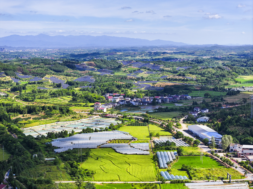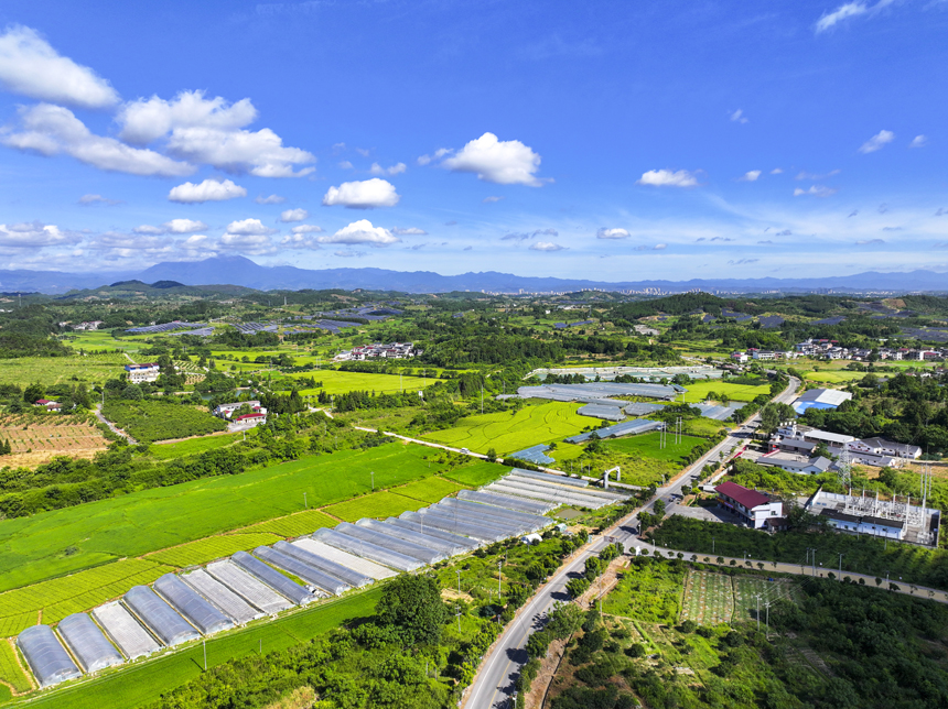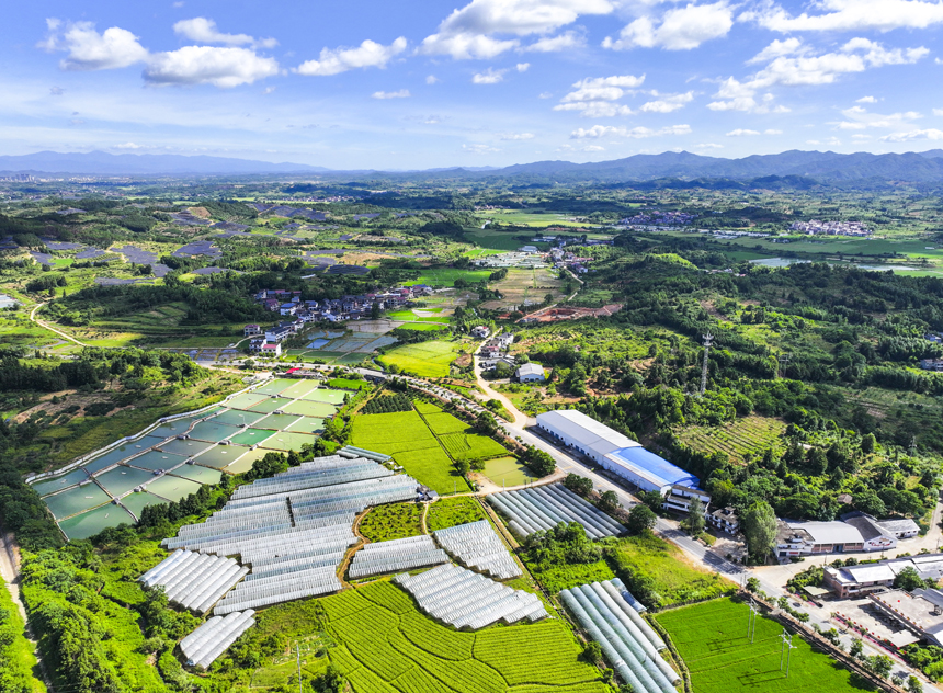 On Aug. 9, greenhouses and dwellings stand in harmony with fields and roads, presenting a picturesque scene of industrial prosperity and rural beauty in Gucheng village of Sangtian town, Nanfeng county, Fuzhou city, east China's Jiangxi Province.