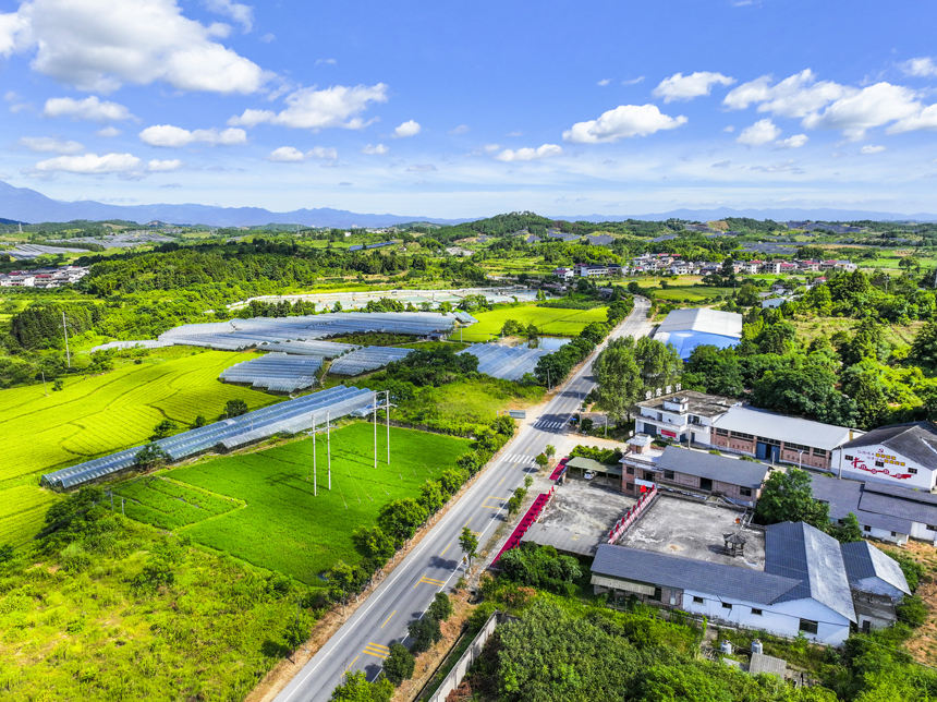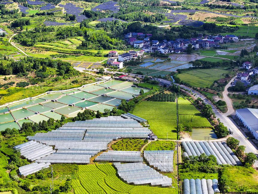 The greenhouses and dwellings stand in harmony with fields and roads, presenting a picturesque scene of industrial prosperity and rural beauty in Gucheng village of Sangtian town, Nanfeng county, Fuzhou city, east China's Jiangxi Province. (Photo/Xie Dong)