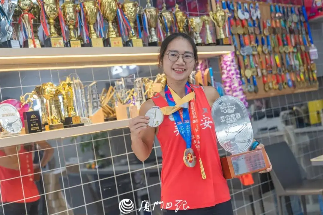 Huang Xuemei, a programmer from Xiamen, southeast China’s Fujian Province, poses for a photo with her medals and trophies obtained in running competitions. (Photo/Xiamen Daily)
