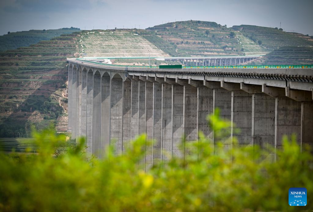 This photo taken on Aug. 16, 2024 shows a vehicle running along the Yinchuan-Kunming highway in northwest China's Ningxia Hui Autonomous Region. A section of the Yinchuan-Kunming highway within Ningxia, from Taiyangshan development zone to Pengyang, was completed and opened to traffic on Friday, marking the full opening of the Yinchuan-Kunming highway.