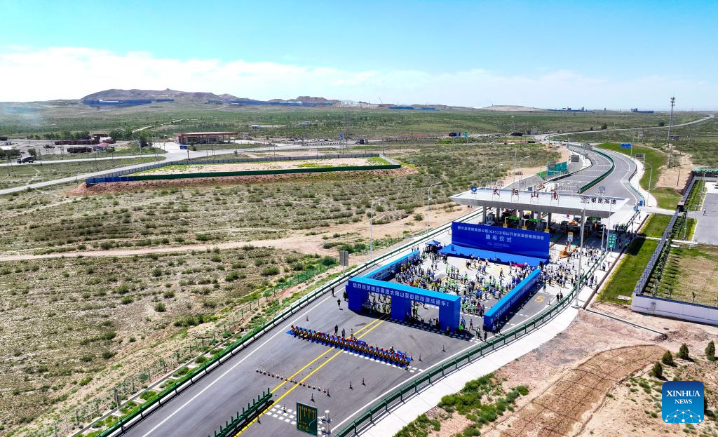 This aerial drone photo taken on Aug. 16, 2024 shows a view of the opening ceremony of the Yinchuan-Kunming highway at the Taiyangshan south toll gate in northwest China's Ningxia Hui Autonomous Region. A section of the Yinchuan-Kunming highway within Ningxia, from Taiyangshan development zone to Pengyang, was completed and opened to traffic on Friday, marking the full opening of the Yinchuan-Kunming highway.