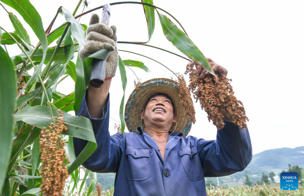 A farmer shows newly harvested sorghum at Yantou Village of Changgang Town, Huairen City of southwest China's Guizhou Province, Aug. 16, 2024. Covering an area of 24,000 hectares, the sorghum fields in Huairen has successively entered its harvest season recently. (Xinhua/Yang Wenbin)
