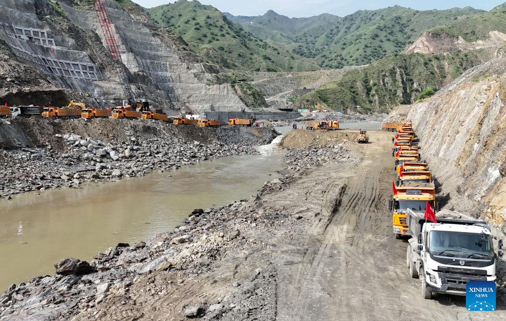 Aerial photo taken on Aug. 16, 2024 shows trucks at the site of the China-built Mohmand Hydropower Project in Swat, northwestern Pakistan. The China-built Mohmand Hydropower Project in Pakistan achieved river closure on Friday, showing that the project construction has entered the fast lane. (China Gezhouba Group Corporation/Handout via Xinhua)